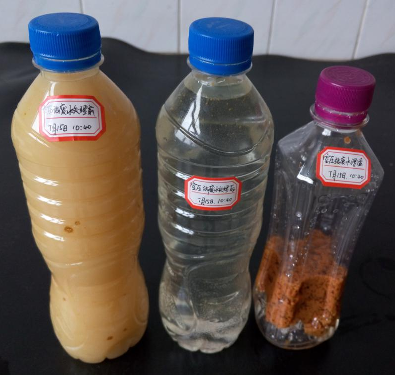 Post treatment result: water sample without treatment (left), treated water (middle), dross (right)